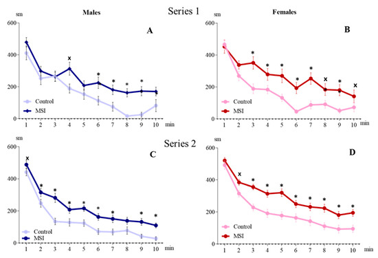 - Knight, P.; Chellian, R.; Wilson, R.; Behnood-Rod, A.; Panunzio, S.; Bruijnzeel, A.W. Sex differences in the elevated plus-maze test and large open field test in adult Wistar rats. Pharmacol. Biochem. Behav. 2021, 204, 173168. [Google Scholar] [CrossRef]