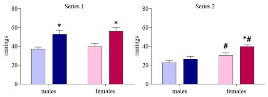 | Sex main effect: F (1, 36) = 4.271, p = 0.046; Sex × Rearing interaction: F (1, 36) = 4.010, p = 0.053 | |||||