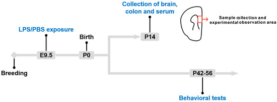 Autism spectrum disorder (ASD) is a group of neurodevelopmental disorders characterized by various behavioral symptoms such as social deficits, repetitive behaviors, and anxiety [1]. To a great extent, the etiopathogenesis of ASD is multifactorial, as it is caused by both genetic and environmental factors and their interactions [2,3]. In fact, numerous studies have found an association between maternal infection and ASD [4,5]. Lipopolysaccharide (LPS), an endotoxin from the cell wall of Gram-negative bacteria, can imitate bacterial infection during pregnancy and induce sickness behavior in offspring [6].