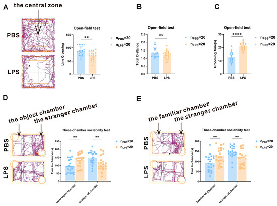 Associated behavioral test results and levels of serotonin in the mPFC of offspring rats between the LPS and PBS treatment groups during the gestational period. (A–C) Total distance traveled, times of line crossing, and grooming time in the open-field test of the two groups (n = 20 per group). (D) Rat spending time of the two groups in the novel object or stranger rat chambers during the three-chamber social test (n = 20 per group). (E) Rat spending time of the two groups in the familiar or stranger rat chambers during the three-chamber social test (n = 20 per group). Values are expressed as mean ± SD. Student’s t-test, ns, not significant, ** p < 0.01, **** p < 0.0001.