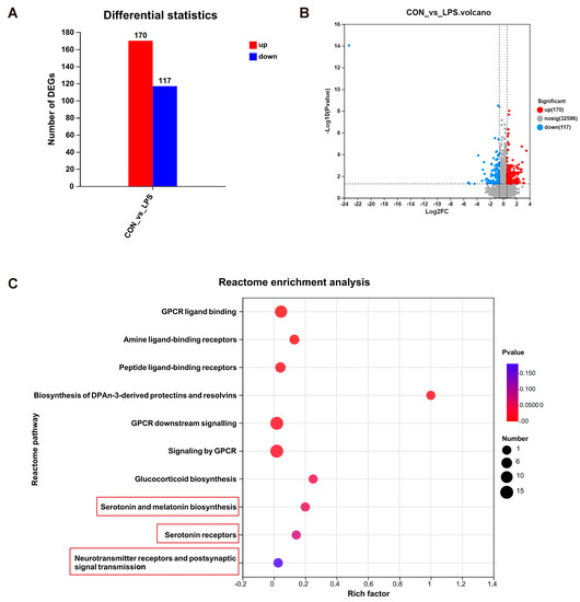 RNA-seq analysis of the offspring rat mPFC between the LPS and PBS treatment groups during the gestational period (n = 10 per group). (A) Differentially expressed gene numbers in the two different treatment groups. (B) Volcano plot of the differentially expressed genes (DEGs). (C) Representative significantly enriched Reactome pathways.