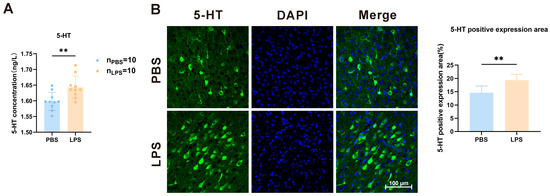 The 5-HT content of the mPFC of 2-week-old offspring was determined using the enzyme-linked immunosorbent assay and immunofluorescence staining to explore whether LPS treatment during gestation causes any change in the serotonin system in the mPFC. As demonstrated in Figure 4A, the LPS offspring exhibited a considerable increase in 5-HT levels (t18 = 3.065, p < 0.001). Figure 4B displays the fluorescence expression area of 5-HT in the mPFC between the PBS and LPS offspring. According to the measured results, maternal LPS exposure significantly elevated 5-HT expression in the mPFC of the offspring (Figure 4B, t10 = 3.472, p < 0.01). Thus, LPS exposure during the pregnancy period induces the serotonin system in the mPFC of the LPS offspring.