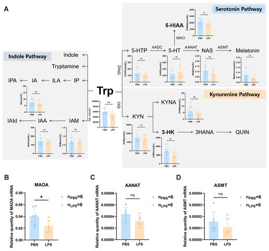 The changes in tryptophan metabolism and the expression levels of MAOA, AANAT, and ASMT in the mPFC of offspring rats between the LPS and PBS treatment groups during the gestational period. (A) Analysis of tryptophan target metabolomics in the prefrontal cortex of offspring rats between the LPS and PBS treatment groups during the gestational period (n = 10 for PBS, n = 9 for LPS). (B–D) The mRNA expression levels of MAOA, AANAT, and ASMT in the mPFC (n = 6 per group). Values are expressed as mean ± SD. Student’s t-test, ns, not significant, * p < 0.05, ** p < 0.01.