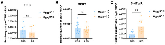 Many key proteins are involved in the anabolism, catabolism, and function of 5-HT. Most reports have supported the conclusion that TPH2, the initial and rate-limiting enzyme in 5HT production, is related to ASD [38,39]. For example, Tph2−/− mice have ASD-related behavioral consequences [40,41]. SERTs are located on presynaptic serotonin nerve terminals as well as on axons and serotonin cell bodies in the raphe [42]. By serving as transporter molecules, SERTs can effectively manage serotonin concentrations by rapidly clearing serotonin from the synaptic gap [43]. A previous study revealed that the 5-HT level is increased in autistic children, and SERT is also increased to clean excess 5-HT from the synaptic cleft, thus limiting its action [44]. At the same time, Miho Tanaka noted that Sert−/− mice also exhibited ASD-associated behavioral changes [30]. However, contrary to expectations, notable differences were observed neither in TPH2 nor in SERT between the LPS and PBS groups. This may be because we chose 2 weeks of age as the test point, when the offspring are still juveniles, whereas other experiments used adult rats. Moreover, different models may have different results. 5-HT can play its physiological function only when it binds to the receptor, and different receptors have different physiological functions [45]. Among them, rodent social and communicative activities have been linked to 5-HT1BR [22,23]. Lawson SK recently revealed that the 5-HT1BR agonist challenge induces autism-related behavior in mice [46]. According to these studies, maternal LPS stimulation increased both mRNA and protein expression levels of 5-HT1BR in the mPFC of 2-week-old offspring. These results imply that LPS had no effect on 5-HT synthesis or degradation but did affect the expression of the receptor in the mPFC during the early neurodevelopment period.