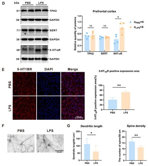 Tryptophan hydroxylase (TPH) is the rate-limiting enzyme of the 5-HT synthesis pathway, including TPH1 and TPH2, which are responsible for 5-HT synthesis of the intestinal and central nervous systems, respectively [19,20]. 5-HT operates through a group of serotonin receptors (5-HTRs) [21]. Among them, 5-HT1BR has been linked to social and communicative activities [22,23]. Then, the selective serotonin reuptake transporter (SERT) transports 5-HT into cells for degradation to maintain the 5-HT system’s homeostasis [24]. To determine the key points of serotonin synthesis, serotonin transporter, and 5-HTRs affected by maternal LPS treatment, changes of TPH2, SERT, and serotonin 1B receptor (5-HT1BR) protein expression in the mPFC of the offspring were detected by Western blotting and immunofluorescence. According to the quantitative analysis of qPCR and Western blot, the mRNA and protein expression levels of TPH2 and SERT exhibited no significant differences between the LPS and PBS groups (Figure 6A,B,D, t6 < 2, p > 0.05; t6 < 2, p > 0.05). The 5-HT1BR mRNA and protein expression levels were significantly increased in the LPS offspring compared with the PBS offspring (Figure 6C,D, t6 = 3.357, p < 0.05). Using immunofluorescence staining, we observed that the 5-HT1BR levels were noticeably higher in the LPS group than in the PBS group (Figure 6E, t4 = 5.386, p < 0.01), which is consistent with the qPCR and Western blot results. These results reveal that maternal LPS therapy affects serotonin biological function through the expression of its receptor 5-HT1BR in the mPFC, whereas it does not impact 5-HT synthesis and reabsorption in the mPFC. Neurons were morphologically observed using Golgi-Cox staining in the mPFC of 2-week-old offspring to further investigate the association between the change in the 5-HT level and ASD-like behavior resulting from maternal LPS exposure. The dendritic branches of the neurons were noticeably shorter in the LPS group than in the PBS group (Figure 6F). According to the quantitative analysis results, dendrite length of the LPS group was significantly lower than that in the PBS group (Figure 6G, t14 = 2.470, p < 0.05). Meanwhile, a remarkable reduction in spine density was observed in the LPS offspring (Figure 6G, t8 = 3.978, p < 0.01). Together, the present findings confirm that maternal LPS exposure contributes to the abnormal morphology of dendrites during the early postnatal period.
