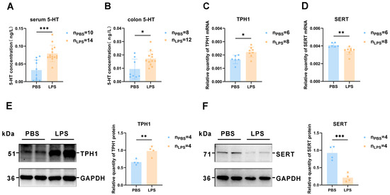 The levels of serotonin and changes in TPH1 and SERT expression levels in the serum and colon of offspring rats between the LPS and PBS treatment groups during the gestational period. (A) Concentration changes in serotonin in the serum of offspring rats between the LPS and PBS groups by ELISA (n = 10 for PBS, n = 14 for LPS). (B) Concentration changes in serotonin in the colon of offspring rats between the LPS and PBS groups by ELISA (n = 10 for PBS, n = 14 for LPS). (C,D) The mRNA expression levels of TPH1 and SERT in the mPFC (n = 6 for PBS, n = 8 for LPS). (E,F) The protein expression levels and their quantification analysis of TPH1 and SERT in the colon (n = 4 per group). Values are expressed as mean ± SD. Student’s t-test, * p < 0.05, ** p < 0.01, *** p < 0.001.