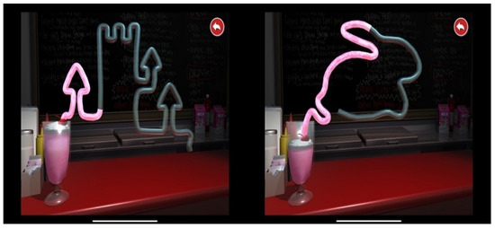 The Lee–Ryan Eye–Hand Coordination Test [34] (SLURP) was used to evaluate fine visually driven motor ability (visuomotor). SLURP was purchased from Apple App Store for $2.10 USD (dated 13 August 2020), and it has been shown that this task is a reliable valid and effective measure of visuomotor integration skills in both children and adults [34,35]. The task requires children to trace five shapes in a particular order after practicing a Castle shape. The Castle item was selected to familiarize children with the procedure and because this relatively difficult item requires many changes in direction while tracing across an iPad screen of 12 inches [35] (see Figure 2). For each child, the time taken to complete five shapes (circle, triangle, square, rabbit, and snail) was extracted and analyzed.