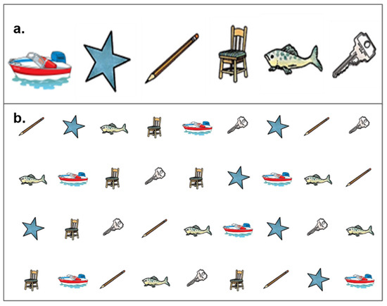 The RAN was originally developed to measure the speed and accuracy of continuous naming responses [23,24,36]. The RAN tasks [37] used in this study consisted of 36 objects of 6 randomly repeated objects (i.e., boat, star, pencil, chair, fish, and key) (Figure 3). It has been suggested that RAN can be used for both visual–verbal (language domain) [38] and processing speed [21] contributions to reading. Participants were required to verbally name each object from left to right as fast and accurately as possible. To ensure the consistency of naming trials, the task begins with a practice trial consisting of all six familiar objects to ensure that all participants understood the names of objects and instructions of the task performance. The time and errors made in naming all objects were recorded. Only the total time score (i.e., how fast participants can verbally name the objects) was analyzed from this task. The RAN task has been demonstrated to be highly reliable (test–retest r = 0.90) [39].