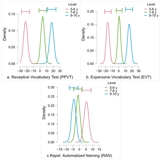 The model-averaged posterior distribution (horizontal bars show the 95% credible intervals around the median) for (a) Receptive Vocabulary Test (PPVT), (b) Expressive Vocabulary Test (EVT), and (c) Rapid Automatized Naming (RAN).