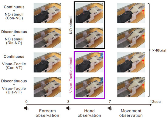 Experimental flow of one trial for all conditions (i.e., Con-NO, Dis-NO, Con-VT, and Dis-VT conditions). Each trial included three phases: Forearm observation (3 s), Hand observation (4 s), and Movement observation (5 s) phase. While visuo-tactile stimuli were delivered during hand observation phase in the VT conditions (Con-VT and Dis-VT: purple rectangle), no stimuli were delivered in the NO conditions (Con-NO and Dis-NO: black rectangle).