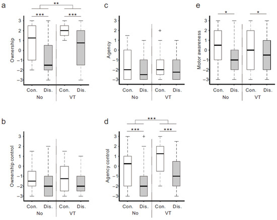 The boxplots in Figure 3 show the medians and interquartile ranges of the questionnaire ratings of the four conditions for the five categories (a–e). For ownership (Figure 3a), a two-way analysis of variance (ANOVA) demonstrated significant main effects of body continuity (Con vs. Dis; F (1,17) = 27.3, p < 0.001) and stimuli (No vs. VT; F (1,17) = 10.5, p < 0.01), but no interaction (p > 0.9). The rating of the Con condition (white box) was higher than that of the Dis condition (gray box) under both the NO (Con-NO (median score, 1.25) vs. Dis-NO (−1.5)) and VT (Con-VT (2.0) vs. Dis-VT (0.75)) conditions. In addition, the ratings of the VT conditions were greater compared to the NO conditions. For ownership control (Figure 3b) and agency (Figure 3c), overall, the ratings were considerably low (medians < −1) and there was no statistically significant difference between the conditions. In agency control (Figure 3d), the ANOVA showed that both main effects were significant (body continuity: F (1,17) = 24.4, p < 0.001; stimuli: F (1,17) = 16.6, p < 0.001). Like the ownership rating, a greater rating of the Con condition compared to the Dis condition was identified under both the stimulus conditions (NO: Con-NO (0.25) vs. Dis-NO (−2.0)) (VT: Con-VT (1.25) vs. Dis-VT (−1.0)). Moreover, the ratings of the VT conditions were greater compared to the NO conditions. Regarding motor awareness (Figure 3e), only the main effect of body continuity was significant (F (1,17) = 5.99, p < 0.05), suggesting that the ratings of the Con conditions (Con-NO (0.25) and Con-VT (0)) were higher than the Dis conditions (Dis-NO (−1.0) and Dis-VT (−0.5)).