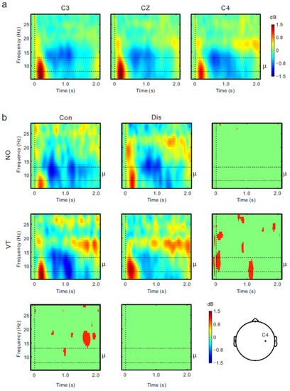 (a) Event-related spectrum perturbation (ERSP) time-frequency plots across conditions at the C3, Cz, and C4 positions. (b) ERSP time-frequency plots for the Con-NO (upper left), Dis-NO (upper middle), Con-VT (middle left), and Dis-VT (middle) conditions at the C4 position. Four panels around ERSP plots show statistically significant difference in time-frequency plots at the p < 0.05 level (permutation tests) between the Con-NO and Dis-NO conditions (upper right), the Con-VT and Dis-VT conditions (middle right), the Con-NO and Con-VT conditions (lower left), and the Dis-NO and Dis-VT conditions (lower middle).