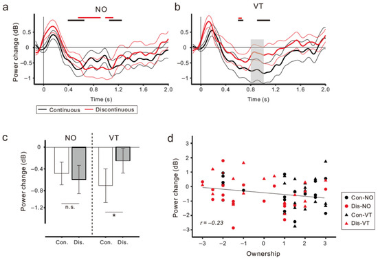 (a,b) Time courses of power reduction in the μ rhythm frequency range in the NO (left panel; (a) and VT (right panel; (b)) conditions, which are computed by the averaged data across the C3, C4, and Cz electrodes. Black and red lines denote the Con and Dis conditions, respectively. One thick and two thin lines denote the mean and ± 1.0 standard error (SE). A gray area in (b) represents an interval in which significant differences were identified between the Con and Dis conditions (p < 0.05; paired one-tailed t-test). (c) Mean power within μ rhythm frequency range from 0.6 to 1.3 s post-movement onset in each condition. Vertical lines denote ± 1.0 SE. Significance is denoted using an asterisk (* p < 0.05). n.s. means not significant. (d) Correlation analysis showing a marginally significant negative correlation between ownership rating and the magnitude of μ rhythm ERD (r = −0.23, p = 0.05).