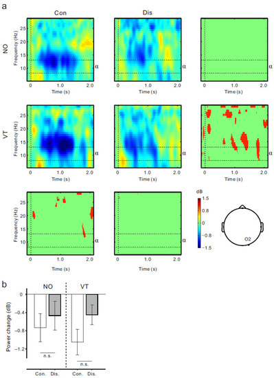 (a) ERSP time-frequency plots for the Con-NO (upper left), Dis-NO (upper middle), Con-VT (middle left), and Dis-VT (middle) conditions at the O2 electrode. Four panels around ERSP plots show statistically significant difference in time-frequency plots at the p < 0.05 level (permutation tests). (b) Mean power within α rhythm frequency range (8−13 Hz) from 0.6 s to 1.3 s post-movement onset in each condition. Vertical lines denote ± 1.0 SE. n.s. means not significant.