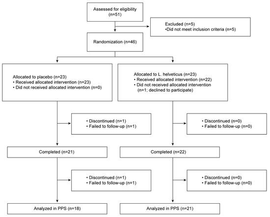 The participant flow diagram is shown in Figure 1. Fifty-one participants expressed an interest in participating in this study, and 46 were considered eligible. A total of 46 participants were randomized into two groups. Of these participants, one declined to participate and withdrew consent prior to the consumption of the test food. One was lost to follow-up and 43 completed the study. In the PPS analysis, four participants were excluded because they did not meet the inclusion criteria or had low compliance, i.e., <60% test food intake during the test period. Therefore, data from 39 participants in the PPS were included in the efficacy analysis.