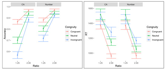 A mixed effects logistic regression (binomial link), with magnitude (cumulative area, number), ratio (contrast coded: 1.25 Ratio = 1; 2.00 Ratio = −1), and congruity (congruent, neutral, incongruent) as factors and accuracy as the dependent variable (random intercept for participant), revealed the main effects of ratio, χ2 (1.00) = 55.32, p < 0.001, and congruity, χ2 (2.00) = 168.14, p < 0.001, and a significant interaction between magnitude and congruity, χ2 (2.00) = 6.15, p = 0.046 (all other ps > 0.18; see Figure 3). Post hoc comparisons indicated accuracy was higher for 2.00 ratio trials and, in descending order, congruent, neutral, and incongruent trials, with higher accuracy for number than cumulative area for neutral and incongruent trials (adj. ps < 0.01).