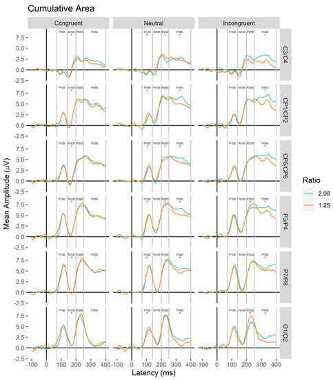 Cumulative area (CA) ERP waveform plots for each electrode pair (central, C3/C4, central-parietal CP1/CP2, lateral-central-parietal, CP5/CP6, parietal, P3/P4, lateral-parietal, P7/P8, occipital, O1/O2). Asterisks below each component label indicate whether significant ratio effects were observed in main or interaction effects in linear mixed models.