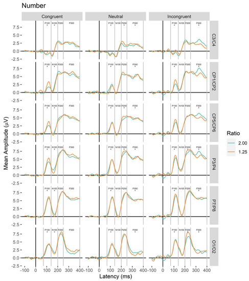 Electrode pairs were selected based on previous research. In previous studies examining the ratio effect, left and right electrode pairs have been created for parieto-occipital and central sites [40,41,43] and studies examining congruity effects have typically focused on electrodes along and near the midline in posterior regions [11,13]. Corresponding electrode pairs were created in the present study for central (C3/C4), central-parietal (CP1/CP2), lateral-central-parietal (CP5/CP6), parietal (P3/P4), lateral-parietal (P7/P8), and occipital (O1/O2) areas (see Figure 2 for positions). In previous research, differences due to format (e.g., digits vs. dot arrays) have been reported in early emerging waveforms, such as the C1 (100–200 ms [46]) and N1 (130–170 ms [43]), and differences due to ratio have been observed in subsequent waveforms, including the P200 (200–500 ms [40,41,43,61]). Congruity effects with non-symbolic stimuli have been observed around 300 ms after stimulus presentation, such as in the P300 [11]. Using this previous research, the following waveforms were identified and analyzed (labeled by amplitude direction and approximate onset after stimulus presentation): P100 (70–140 ms), N100 (141–200 ms), P200 (201–250 ms), and P300 (251–400 ms).