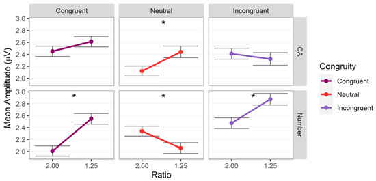 P100 mean amplitudes for post hoc comparisons investigating the interaction between magnitude (cumulative area = CA), ratio, and congruity. Error bars indicate standard errors. Asterisks indicate significant ratio effects (p < 0.05).