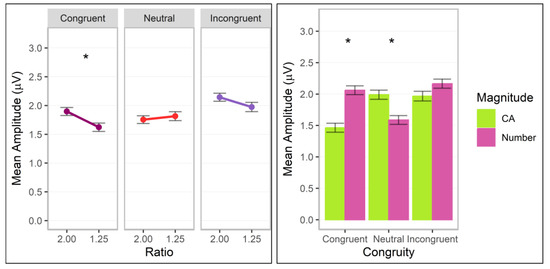 N100 mean amplitudes for post hoc comparisons investigating the interactions between congruity and ratio (left panel) and between magnitude (cumulative area = CA) and congruity (right panel). Error bars indicate standard errors. Asterisks indicate significant ratio effects (left panel) and magnitude differences (right panel; p < 0.05).