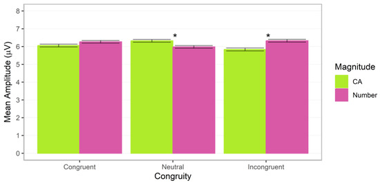 P200 mean amplitudes for post hoc comparisons investigating the interactions between magnitude (cumulative area = CA) by congruity. Error bars indicate standard errors. Asterisks indicate significant magnitude differences (p < 0.05).