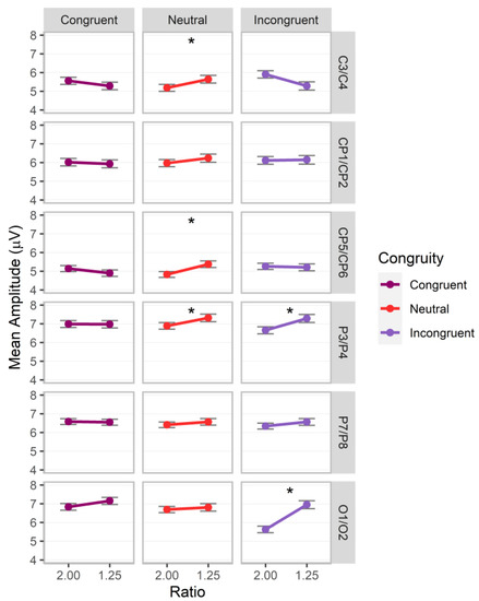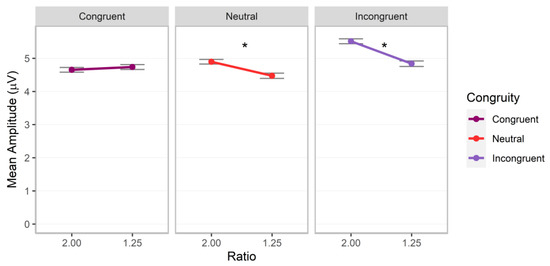 P300 mean amplitudes for post hoc comparisons investigating the interactions between ratio and congruity. Error bars indicate standard errors. Asterisks indicate significant ratio effects (p < 0.05).