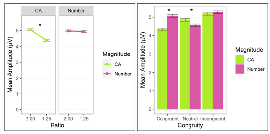 P300 mean amplitudes for post hoc comparisons investigating the interactions between magnitude (cumulative area = CA) and ratio (left panel) and between magnitude and congruity (right panel). Error bars indicate standard errors. Asterisks indicate significant ratio effects (left panel) and magnitude differences (right panel; p < 0.05).