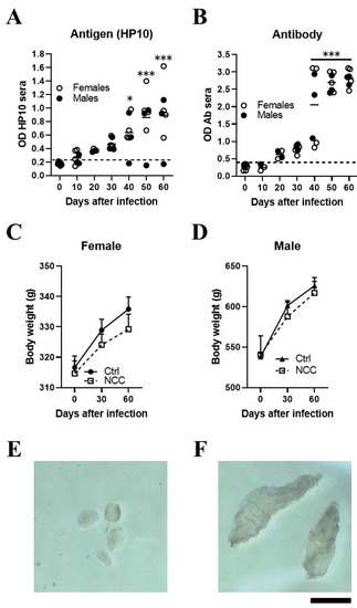 Less weight gain was observed in the EXP-NCC rats compared to the control rats (non-infected rats, Ctr), which was more marked in females (p = 0.41) than in males (p = 0.60) (Figure 1C,D). In addition, the size of cysticerci in CSF samples obtained directly from the cisterna magna on day 60 post-infection (Figure 1F) was clearly larger than that of the parasites when inoculated at the onset of infection (Figure 1E).