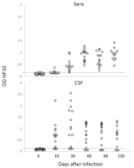 Interestingly, for the first time, it was demonstrated that the infection, as in humans, can be diagnosed by detecting the HP10 antigen in both CSF and serum, even though the latter showed lower values, as shown in Figure 2. This result is of particular interest as it suggests that, as in humans, a serological marker will allow us to follow the course of the infection.