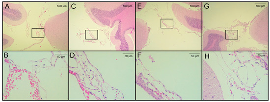 Histological analysis of H&E-stained brain sections from rats infected with T. crassiceps cysts on day 120 post-infection. (A,B) Coronal sections at different magnifications of the brain of a healthy rat in a region proximal to the cisterna magna (extraparenchymal/meningocortical region), with slight congestion and no obvious pathological change. (C) Region of the cisterna magna proximal to the cerebellum from an infected female rat. (D) Magnification of panel C, showing hemorrhagic meninges and edema unrelated to the presence of parasites. (E) Pericystic region in the cisterna manga of an infected female. (F) The magnified section shows few histopathologic changes. (G) Infected male, in the region of the cisterna magna proximal to the cerebellum (between the cerebellum and atlanto-occipital membrane) and magnification (H) with no remarkable histological changes. Images of 3 infected animals are shown. Scale bar = 500 and 50 µm. Black boxes show sites analyzed at higher magnification.