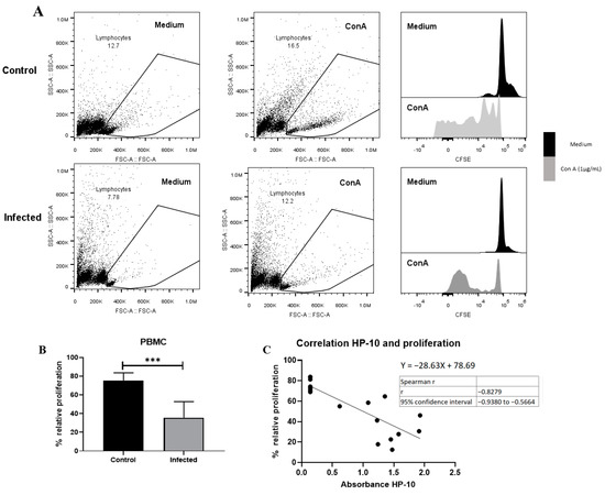 EXP-NCC by T. crassiceps cysticerci decreased PBMC proliferation in rats. (A) Representative dot plot and histograms of control and infected groups. A decrease in proliferative response was observed in cells with low complexity and small size (presumptive lymphocytes). (B) Infected rats showed lower relative proliferation than controls. Relative proliferation is shown as mean ± SD %. (C) Negative correlation between HP10 levels and PBMC proliferation. Data are shown as mean ± SEM (n = 8 per group). Data normality was assessed with a Shapiro–Wilk test (p > 0.05). Relative proliferation was compared with a two-tailed unpaired Student’s t-test (T = 5.643; df = 14; p = 5.76 × 10−5). Spearman correlation (rs = −0.82 and confidence interval −0.938 to −0.56, XYpairs: 17, p = 1 × 10−4) analysis was performed between relative proliferation and HP-10 levels. Statistically significant differences are labeled as p < 0.001 ***.