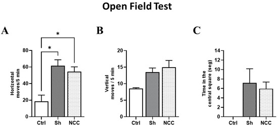 Behavior assessment in the open field test. Bar graphs of behavior parameters for control, sham, and infected rats. (A) Number of horizontal movements (transitions) during a 5 min period. (B) Vertical movements, defined as the number of times the rat stands on its hind legs during a 5 min period. (C) Time spent in the central square. * p < 0.05 vs. control. Data are shown as mean ± SEM (n = 4 for control and sham groups; n = 20 for NCC group, 10 females and 10 males). The normality of data on horizontal and vertical movements was assessed with a Shapiro–Wilk test, p > 0.05. Differences in horizontal and vertical movements were assessed with ANOVA, followed by the Tukey test: horizontal moves: F = 4.42, df = 2, and p = 0.0232; vertical moves: F = 1.249, df = 2, and p = 0.3047. Time in the central square has non-parametric distribution (Shapiro–Wilk test, p = 0.0079) and, thus, was compared with a Kruskal–Wallis test (KW, χ2 = 5.4; df = 2; p = 0.067). Statistically significant differences are labeled as p < 0.05 *.