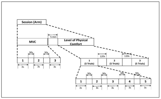 The experimental protocol included isometric arm exertions at different levels of physical comfort [47]. To assess the level of maximum voluntary contraction (MVC), we asked the participants to increase the exerted force to the maximum possible level without jerking and to maintain the exertion for 3 s [48]. An average of three MVC trials were recorded. Next, the participants performed isometric arm exertion in the same posture (see Figure 1) at five predefined levels of physical comfort: very low (VL), fair (F), moderate (M), high (HH), and very high (VH). In each experimental set, the comfort levels were applied in random order to minimize learning effects. Thirty seconds of rest was applied between all experimental sessions. The assigned levels of comfort were selected from the proposed 11-point unipolar rating of the perceived physical comfort scale (see Table A1 in the Appendix A). This scale was developed based on the assumption that the level of physical comfort is associated with a corresponding magnitude of physical exertion [49]. For each exertion, the exerted force was measured with a TorbalTM FC 5k series force meter (Scientific Industries, Inc., Bohemia, NY, USA). After each exertion, the participants were also asked to assess their physical effort on Borg’s scale of RPE [26]. The detailed study protocol is shown in Figure 2.