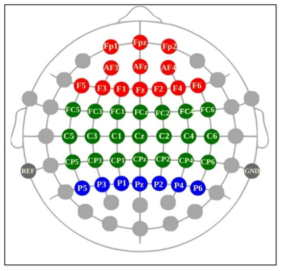 Because cognition, motor planning, attention, and perception are executed in the frontal, central motor, and parietal cortices [56], we selected 41 channels covering these regions for potential analysis. The analyzed EEG band frequencies were theta (4–8 Hz), alpha (8–13 Hz), beta (13–30 Hz), and gamma (30–50 Hz) [57]. Alpha waves are inversely associated with cortical activation and represent a relaxed state [58]. Theta, beta, and gamma bands are primarily associated with motivational processes, memory, and emotion; sensorimotor behavior; and attention and object representation, respectively [59]. Although EEG has a high temporal resolution, the selected channels have typically been used in prior research for the investigation of the brain motor cortex and cognitive functions [60]. The region-based classification of the channels used in this study is illustrated in Figure 3. The PSD for all major brain wave frequencies was computed with MATLAB. PSD is an estimate of total power distribution over the frequency [61]. Thus, the PSD, or power spectra, measures the power of a signal for a certain frequency domain.