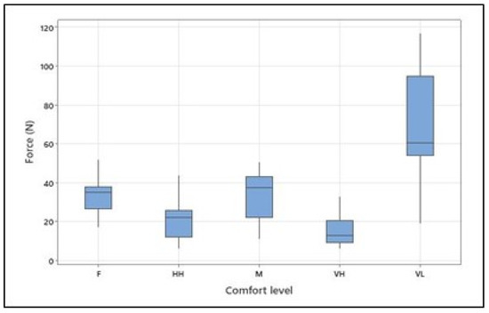 Isometrically generated arm forces at different levels of physical comfort (VL, F, M, HH, and VH correspond to very low, fair, moderate, high, and very high, respectively). Figure 4. Alt text: Force at different levels of physical comfort across all participants.