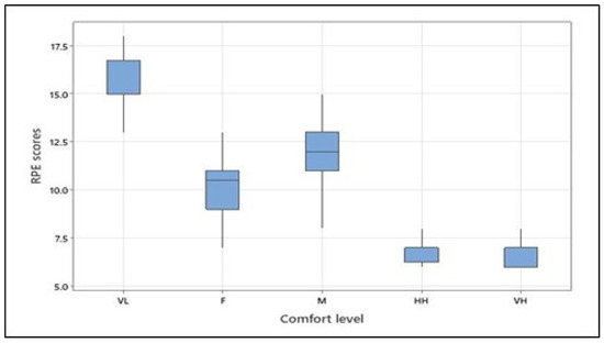 The ANOVA revealed that the rate of perceived exertion (RPE) at different levels of predefined physical comfort significantly differed (see Table 5). The means (and standard deviations) of the RPE scores were as follows: 15.46 (1.79) for very low comfort, 10.00 (1.77) for fair comfort, 12.08 (1.53) for moderate comfort, 7.04 (0.86) for high comfort, and 6.46 (0.59) for the very high level of physical comfort. Tukey’s pairwise comparison confirmed differences between RPE scores for all comfort levels with a 95% confidence level, except for high and very high levels, which did not statistically differ. It should be noted that for both the arm forces and the RPE scores, the moderate comfort category was higher than the fair comfort category, thus indicating that the participants perceived and applied more effort for the moderate than the fair physical comfort level (see Figure 5).