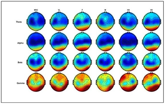 Other major findings included greater perceived exertion and physiological stress after the assigned leg exercise. After a leg-resistance exercise with cognitive tasks, a decrease in EEG oscillations and beta cortico-muscular coherence was observed [31]. Furthermore, an increase in theta power and a more active frontal region was reported by combining both physical and cognitive tasks; the perception of exertion significantly increased with the intensity of physical exercise [32]. Some of these investigations can be interpreted as indicating that a high level of physical comfort resulting from relaxing, low-intensity exercise is associated with an increase in alpha and theta spectral power [33,34]. However, a direct assessment of EEG signatures associated with isometric forces at different levels of physical comfort and their perception remains an unexplored area.