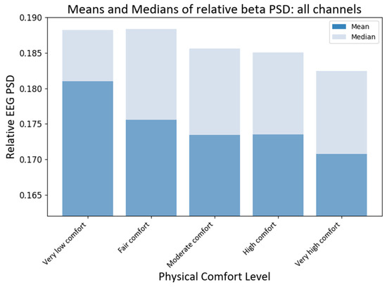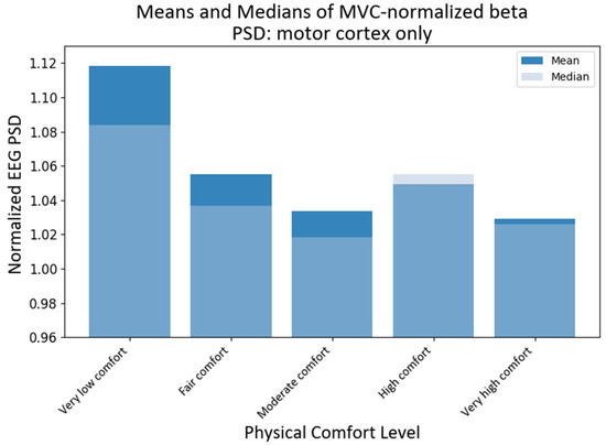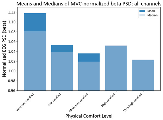 Grand average and median values of NPSD beta power at different levels of physical comfort. Figure 8. Alt text: This bar chart depicts the grand average and median values of the normalized beta power with vertical bars at different levels of physical comfort.