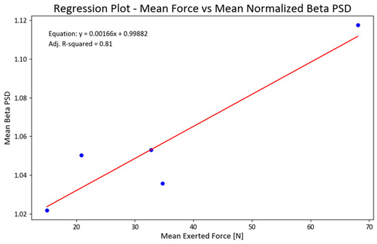We also ran a regression analysis between the mean forces and total NPSD for all EEG channels. The obtained linear regression demonstrated statistical significance (F = 18.61; p < 0.022) and accounted for 81% of the variance in the data (refer to Figure 9). To ensure the fulfillment of underlying regression assumptions, we conducted tests for the normality of residuals, heteroscedasticity, and multicollinearity. Considering the limited sample size, we examined the skewness and kurtosis of the beta PSD data used in the regression, resulting in values of −0.4 and 2.4, respectively.
