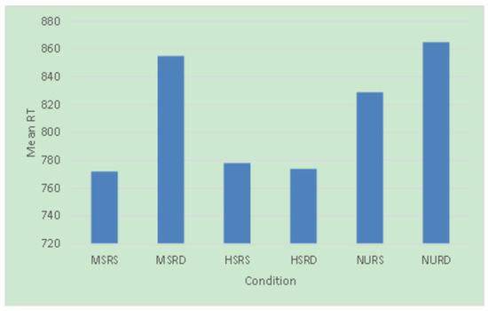 For the response time data (see Figure 1 for details), we used the LmerTest package of R software to fit a mixed-effects model with logarithmic response time as the dependent variable, morphemes (MS, HS, NU) and relations (RS, RD) as fixed factors, and subject and item as random factors [17,18,19]. We found that morphemes have a main effect, F (2, 2287.4) = 6.99, p = 0.0009, and the relation also has a main effect, F (1, 2276.2) = 7.19, p = 0.0074, but there is no interaction between them, F (2, 2275.6) = 0.97, p = 0.3797. Contrast analysis showed that the response time of NU conditions was significantly slower than that of MS and HS (MS vs. NU: 794 vs. 850 ms, β = −77.94, SE = 30.30, t = −2.57, p = 0.0102; HS vs. NU: 771 vs. 850 ms, β = −72.58, SE = 30.57, t = −2.37, p = 0.0177), while there was no significant difference between MS and HS (MS vs. HS: 794 vs. 771 ms, β = 5.36, SE = 30.31, t = 0.18, p = 0.8597). The response time of the RS condition is significantly faster than that of the RD condition (RS vs. RD: β = 80.92, SE = 30.42, t = 2.66, p = 0.0079). The logistic regression method was used to analyze the accuracy of data. Because the accuracy reached the ceiling (above 98%), all the analyses were statistically non-significant.