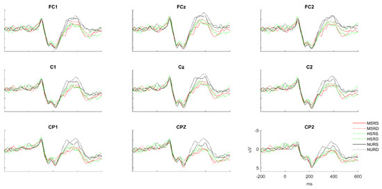 Grand average ERP waveforms for all conditions in 9 representative electrodes. MSRS: prime sharing the modifier and the relation with the target; MSRD: prime sharing the modifier with but differing in the relation from the target; HSRS: prime sharing the head and the relation with the target; HSRD: prime sharing the head with but differing in the relation from the target; NURS: prime sharing no constituent but have the same relation with the target; NURD: prime sharing neither constituent nor the relation with the target.