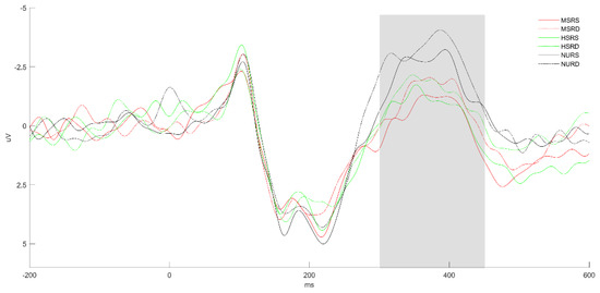 To test whether this relation effect appeared in the earlier period (N200), we took a time window of 185–207 ms and performed a morpheme (3) × relation (2) repeated-measures ANOVAs on the average amplitude of the nine electrodes mentioned above. No main effects were found in the morphemes and relations (F (2, 155) = 1.93, p = 0.149; F (1, 155) = 0.38, p = 0.537), and there was also no interaction between them (F (2, 155) = 0.04, p = 0.960). However, as shown in Figure 4B, although it did not show a significant difference, there is a trend of relation effects. That is, RS conditions have increased amplitude relative to RD in MS and NU, except for HS.