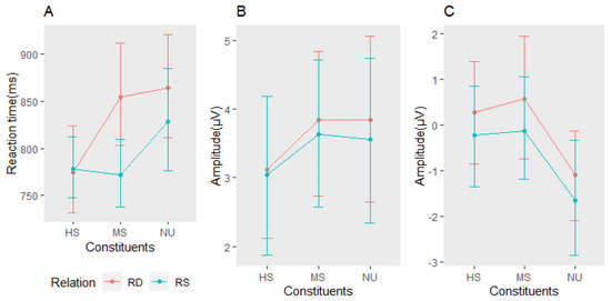 Next, we explain the behavioral results. It can be seen from Figure 4A that, for the three morpheme levels, the amplitude reduction in RS relative to RD is the largest at the MS level, followed by the NU, and almost zero at the HS. It indicated that in the modifier-repeated conditions, relation plays the largest role in whole word processing. So the relation priming in the modifier-repeated condition was the first to be discovered by researchers [6,9,10,27]. In combination with the HS level results, we infer that the relation is easier to extract when there is morpheme repetition, regardless of whether it is a modifier or head. Head-repeated condition is an exception, in which relation priming is inhibited by constituent priming, so no effect was manifested. In the no morphemes repeated condition, the relation is more difficult to extract because subjects need to extract the relation of prime without the help of specific concepts and then apply it to target recognition. This process is relatively complicated, so the relation priming shown is smaller than that of MS, and the reaction time is longer.