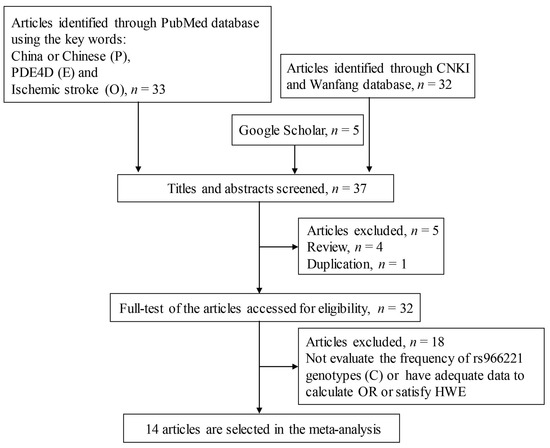 - Jiang, D.; Li, H.; Li, J.; Xiao, Y.; Gan, L.; Luo, M. Relationship between phosphodiesterase 4D gene rs966221 single nucleotide polymorphisms and ischemic stroke. Chin. J. Geriatr. Heart Brain Vessel. Dis. 2018, 12, 271–274. [Google Scholar]