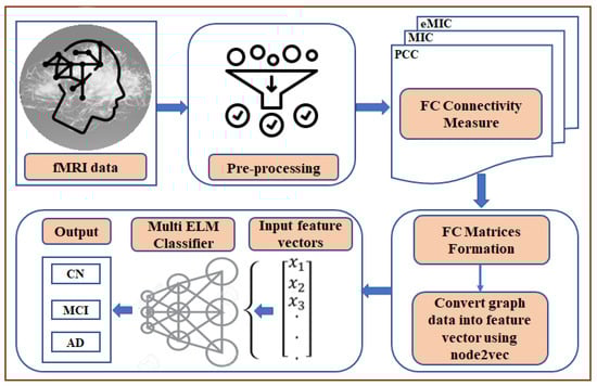 The proposed method, as depicted in Figure 2, consists of several steps to classify AD versus CN, CN versus MCI, and AD versus MCI. The first step involves retrieving the fMRI data from the Alzheimer’s Disease Neuroimaging Initiative (ADNI) database. The fMRI data are then subjected to standard preprocessing steps, including motion correction, slice timing correction, normalization, and spatial smoothing, to ensure data quality and consistency.