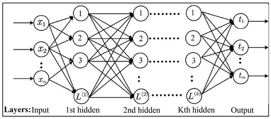 The extreme learning machine (ELM) is a single hidden layer feedforward neural network (SLFN) that demonstrates faster convergence rates compared to traditional approaches, resulting in remarkable outcomes [38,39]. The SLFN randomly selects hidden layer weights, and the Moore–Penrose inverse is used to analytically estimate the parameters of the output layer [40]. As a result, the tuning of hidden layer parameters does not require gradient-based backpropagation. This enables exceptionally fast training, making it particularly suitable for analyzing big data. ELM offers several advantages over conventional neural networks and support vector machines, including rapid learning, straightforward implementation, and minimal user intervention [41]. However, due to its shallow architecture, feature learning with ELM approaches may not be practical for certain applications, even with a large number of hidden nodes. In this study, we utilized a multilayer ELM as described in [42]. As illustrated in Figure 3, each layer is connected to the layer above it in a feedforward manner.