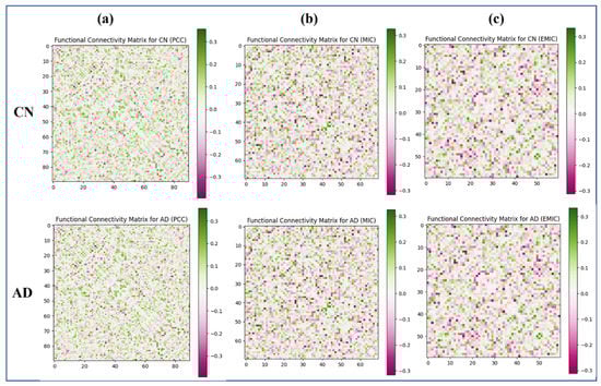 Functional connectivity matrices based on PCC, MIC, and eMIC (for CN and AD group). (a) FC Matrices of CN and AD group using PCC (b) FC Matrices of CN and AD group using MIC (c) FC Matrices of CN and AD group using eMIC.