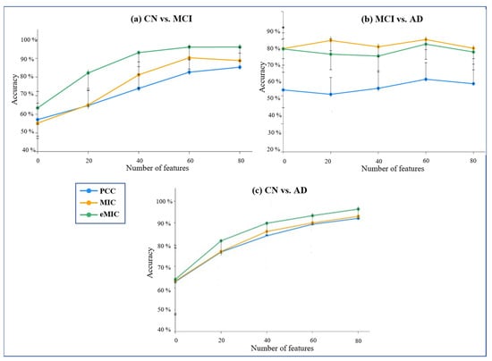The classification accuracy of CN versus MCI based on various feature counts is shown in Figure 4a. Features utilized by eMIC produced the highest classification accuracy. The features calculated using PCC, on the other hand, produced the lowest accuracy rate. The accuracy of the classification remained stable as the number of features increased.