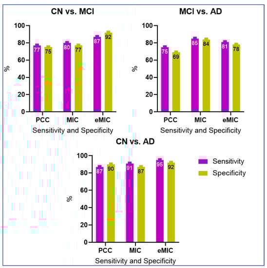 Based on features extracted from PCC, the sensitivity and specificity of classification for CN and MCI were 77 and 75%, respectively, as shown in Figure 5a. The scores for MIC and eMIC based classification were 80 and 77%, and 87 and 92%, respectively. As per Figure 5b, the classification of MCI and AD showed a sensitivity and specificity of 75 and 69.5%, respectively, for features acquired from PCC, 85 and 84% for features extracted from MIC, and 81 and 78% for features extracted from eMIC. As per Figure 5c, the sensitivity and specificity for classifying CN and AD using features from PCC were 87 and 90%, respectively, as compared to MIC’s 91 and 87% and eMIC’s 95 and 92%. Many studies have been carried out utilizing rs-fMRI to differentiate AD and MCI from CN. As stated previously, the proposed work achieves the best level of accuracy for AD classification (95% (CN vs. AD) using eMIC-based FC matrices.