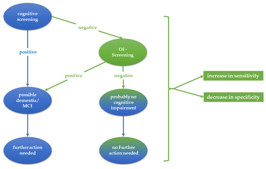 In order to assess the practical benefit of a combined diagnostic use of cognitive and OI screenings, sensitivity and specificity were also calculated in the case of at least one positive result in one of the two tests. As depicted in Figure 1, the use of an OI test in addition to a cognitive screening test should increase sensitivity at the expense of reducing specificity. OI screening should detect some subjects with possible MCI or DEM not correctly identified by the cognitive screening. On the other hand, there is an increased risk that unimpaired persons will be incorrectly classified as impaired in one of the two methods. For this reason, sensitivity and specificity were calculated for different diagnostic scenarios using cutoff scores of ≤26, ≤27, and ≤28 for the MMSE, of ≤11 for the SS-OIT, and of ≤2 and ≤1 for the B-OIT.